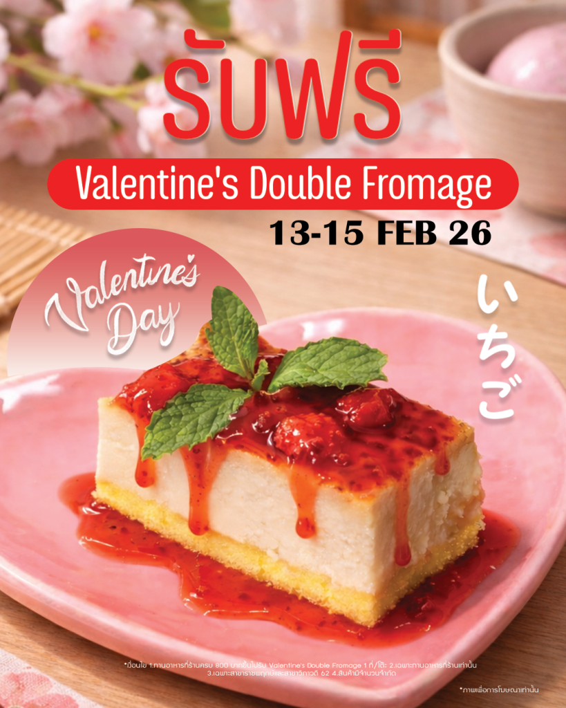 - ทานอาหารที่ร้านครบ 800.- ขึ้นไป (ราคาไม่รวม VAT 7% และ Service Charge 3%) รับฟรี Valentine’s Double Fromage 1 ที่/โต๊ะ